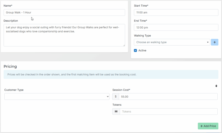 A local dog walking business struggled to manage both flexible solo bookings and recurring group walks. Walkers had to manually coordinate availability and repeat sessions, leading to double-bookings and missed walks. Pet Manager offers two tailored scheduling modes for dog walking. First, walkers can set their own availability roster, allowing clients to book private walks in flexible time blocks - like thirty or sixty minutes - based on what's offered. Second, businesses can run structured group walks at set times with capacity limits. Clients can join one-off or recurring group sessions - say, every Monday at 9 a.m. - making it easy to fill slots and build steady routines. Everything is seamlessly booked and tracked in one system.
